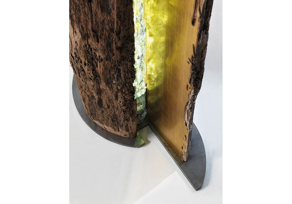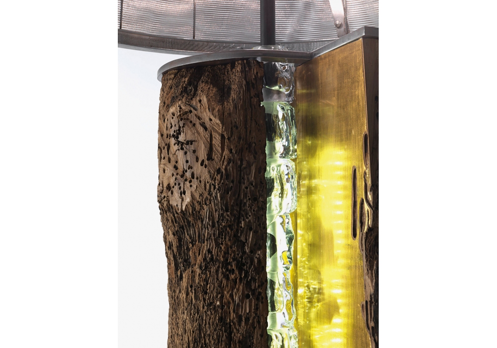 Serena firmata da Erasmo Figini per Riva 1920 è una lampada da terra con stelo realizzato in legno massello di Briccola e paralume ricavato da tela metallica che funge da diffusore dei quattro corpi illuminanti a bulbo.