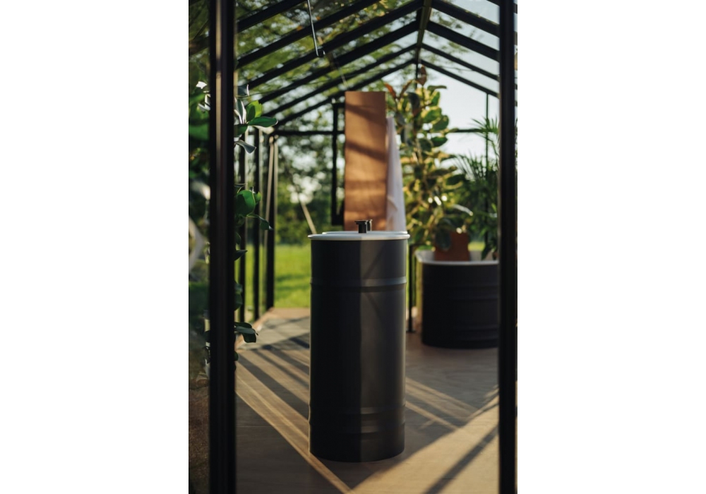 Vieques firmato da Patricia Urquiolai per Agape è un lavabo a colonna tondo con appoggio a terra realizzato in acciaio inox verniciato bianco o bicolore. Non è previsto foro per rubinetteria; a scarico libero. Accessoriabile con mensola porta oggetti in iroko da posizionare sul bordo del lavabo. Su richiesta disponibile anche con gancio porta salviette in acciaio verniciato bianco da fissare sul lato inferiore della mensola.
