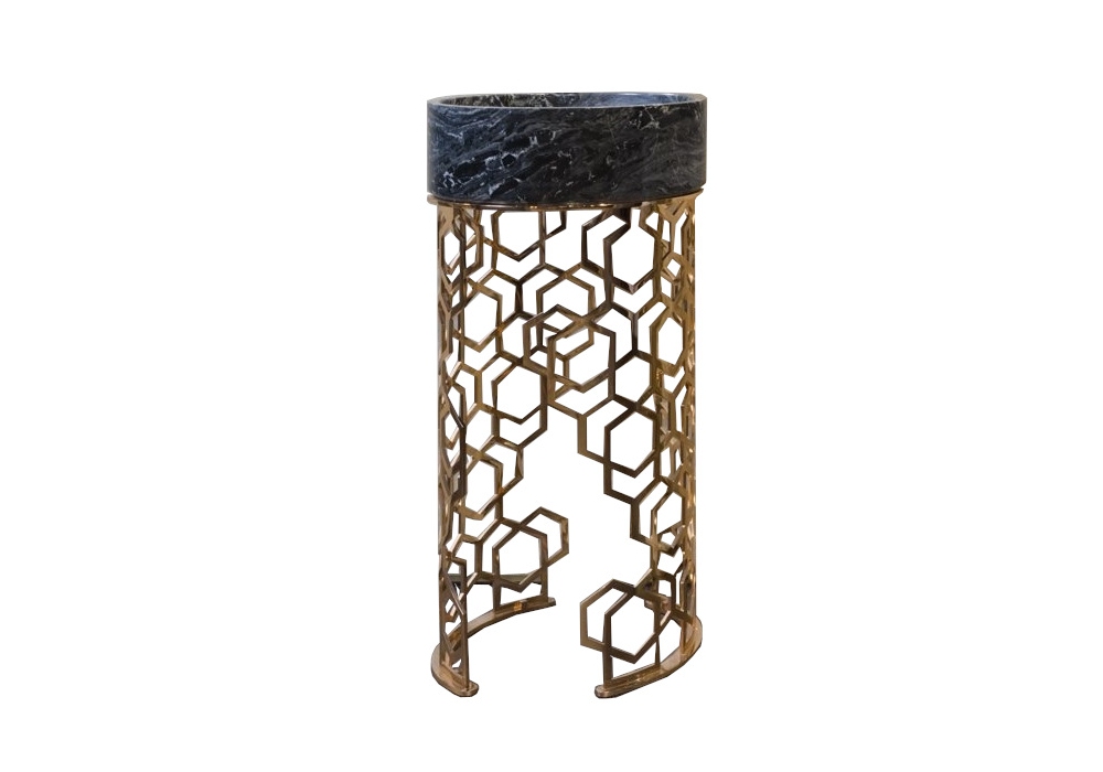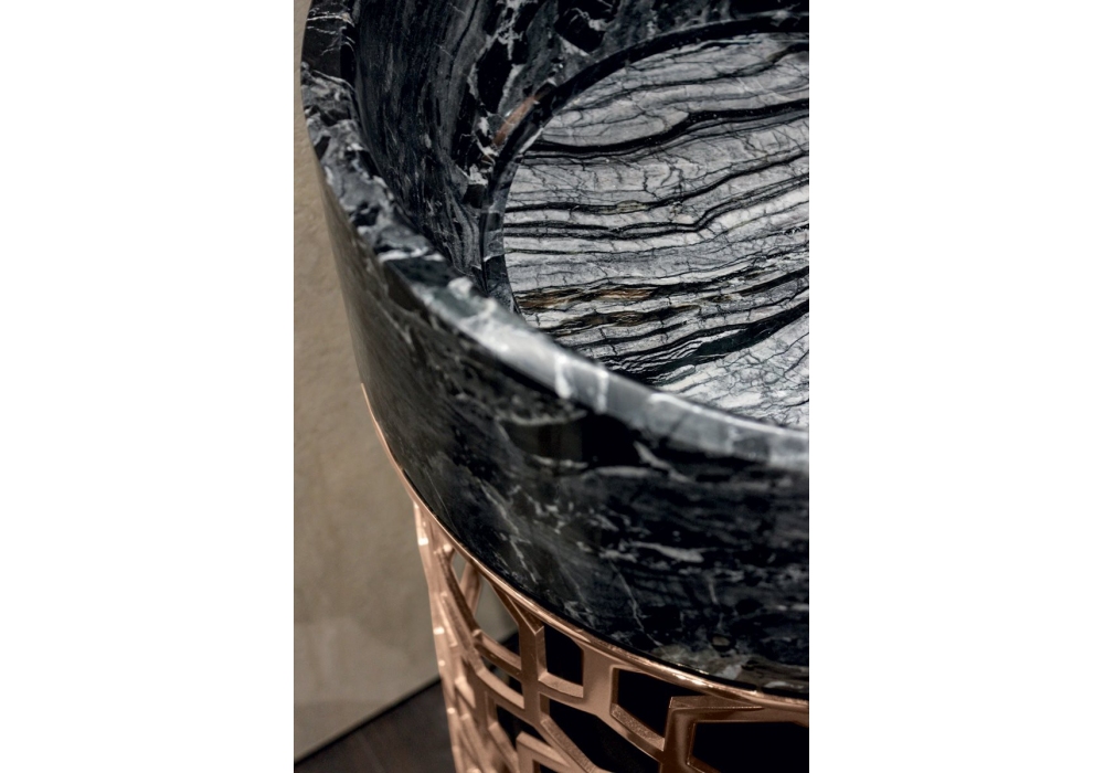 Jacqueline firmato da Giuseppe Iasparra per Longhi è un lavandino con base lavorata in metallo rettificato tagliato con laser a decoro “Sequence” e calandrato in diverse finiture. Vasca lavabo in marmo.