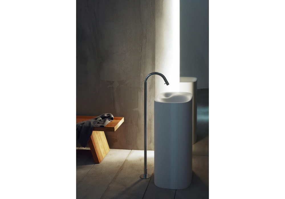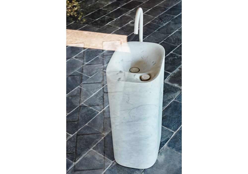 Nivis firmato da Andrea Morgante (Shiro Studio) per Agape è un lavabo a colonna rettangolare realizzato in Cristalplant® biobased o in marmo in differenti finiture. Non è previsto il foro per il rubinetto. Dispone di foro per troppo pieno ricavato da un piccolo invaso collegato al bacino principale, che ha anche la funzione di portasapone. Disponibile nella versione con scarico a parete o a pavimento.