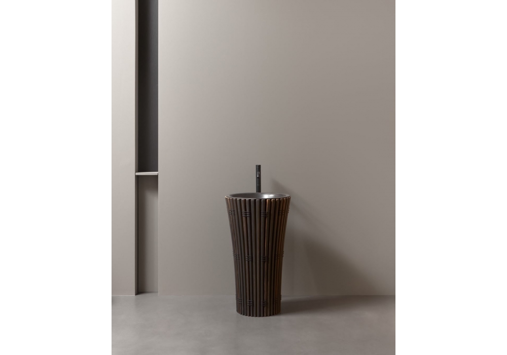 Ramses & Sfera firmato da AMDL Circle per Antonio Lupi è un lavabo da terra realizzato con colonna in listelli di legno, completo di scarico a pavimento, piletta a scarico libero, sifone e tubo flessibile. Lavabo Sfera in Acciaio Inox AISI 316 in diverse finiture.