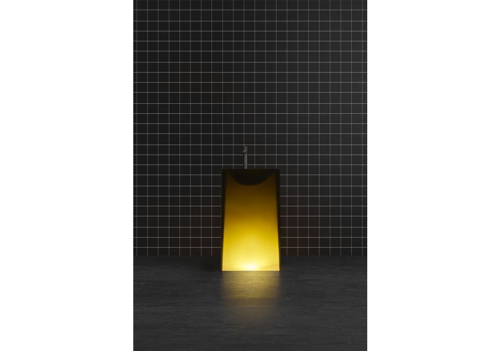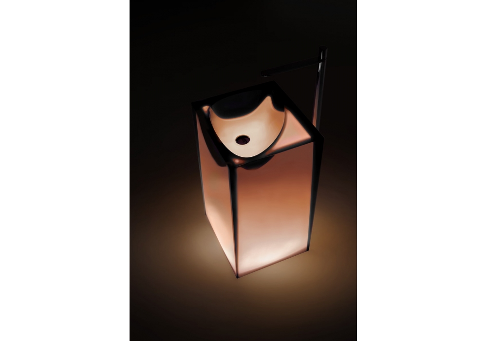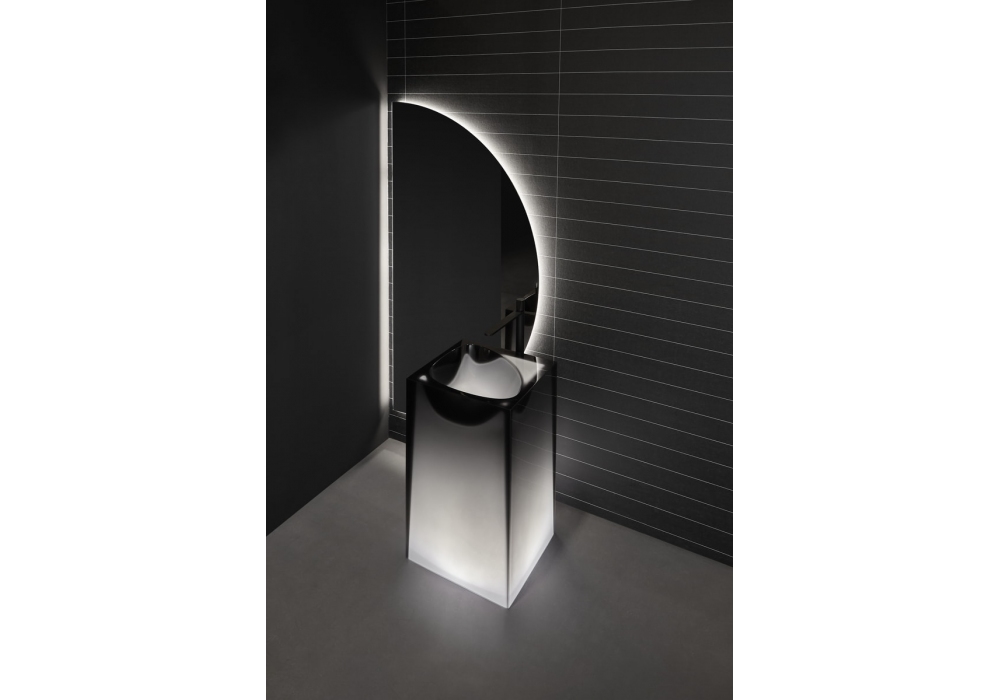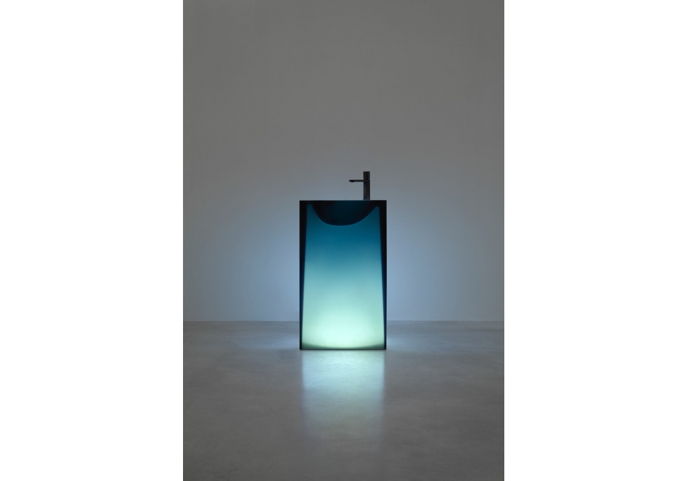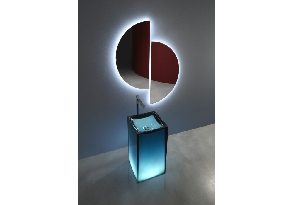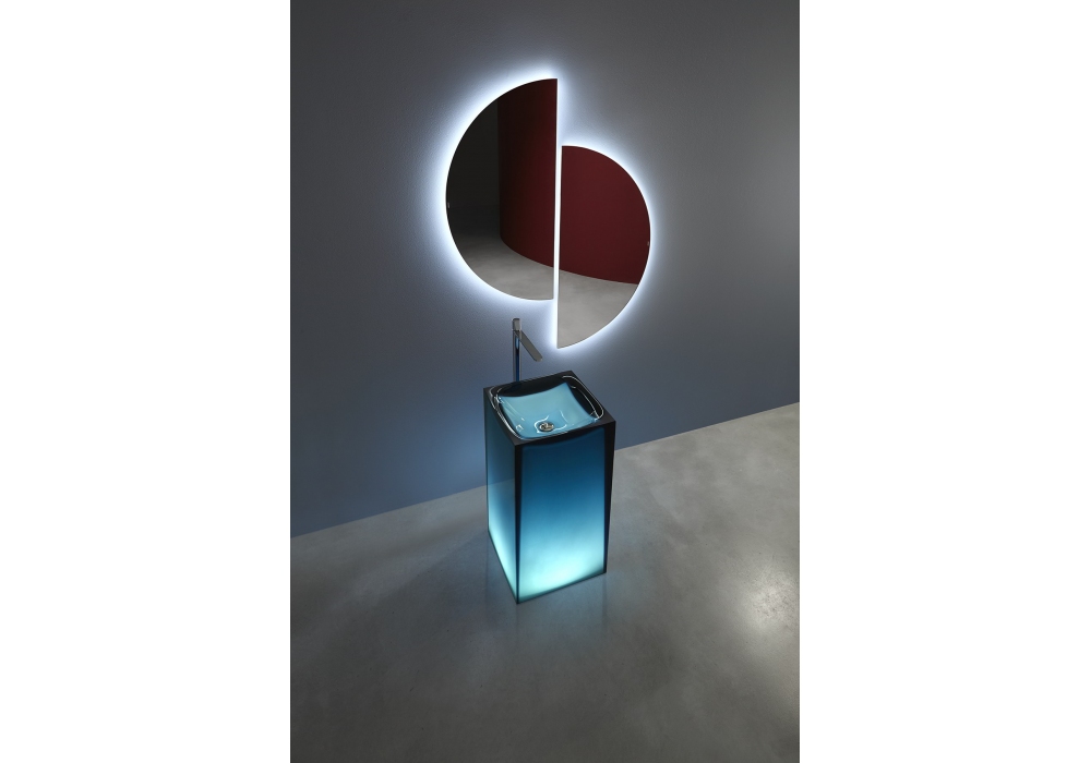 Astro e Aura firmato da Marco Piva per Antonio Lupi è un lavabo da terra realizzato in Cristalmood o Icemood con scarico a pavimento, con o senza illuminazione a led. Fusto opaco completo di piletta a scarico libero, sifone e tubo rigido.