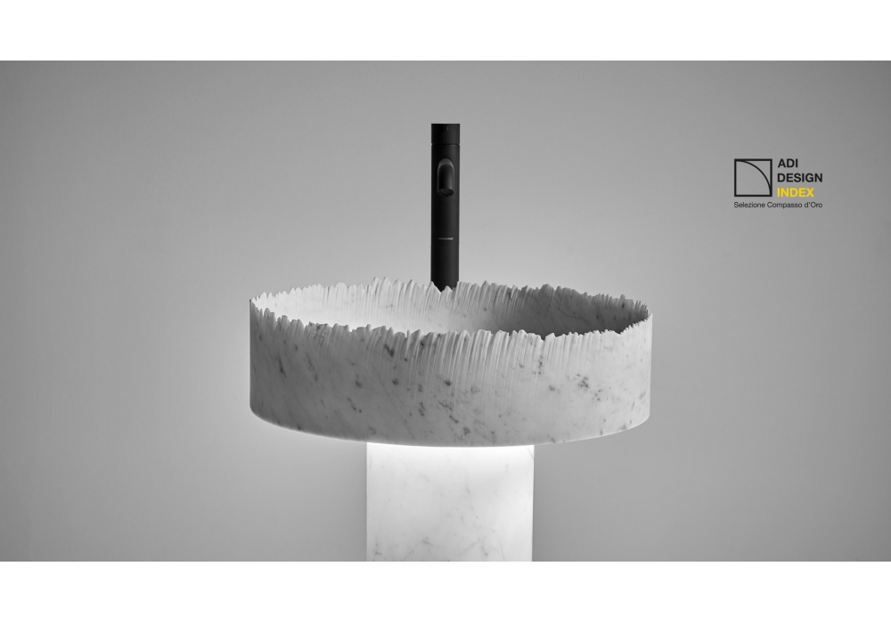 Flow firmato da Paolo Ulian per Antonio Lupi è un lavabo da terra realizzato in pietra con scarico a pavimento, con o senza illuminazione a led, completo di piletta con scarico libero, sifone, tubo rigido e, nella versione a led, incluso di trasformatore.