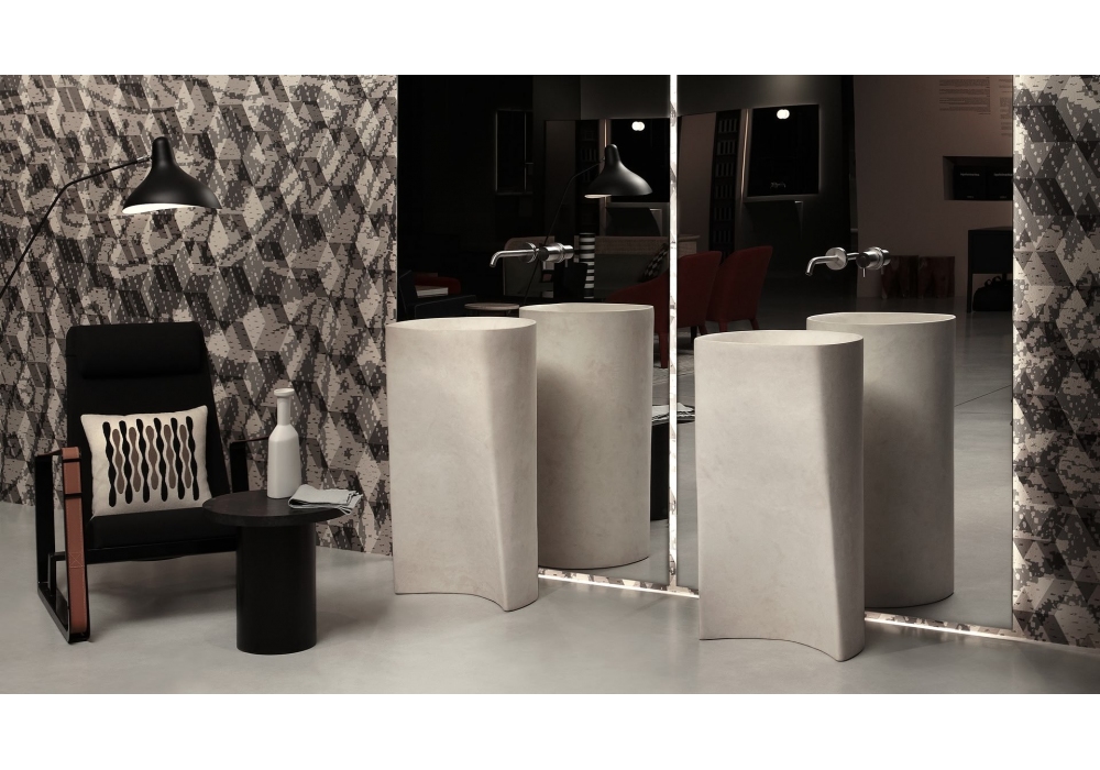 Rilievo firmato da Carlo Colombo per Antonio Lupi è un lavabo da terra in pietra con scarico a pavimento, completo di piletta con scarico libero, sifone e tubo flessibile.