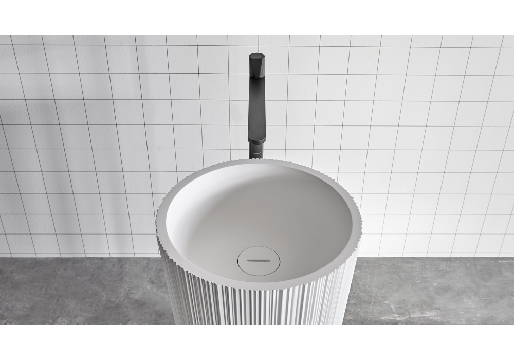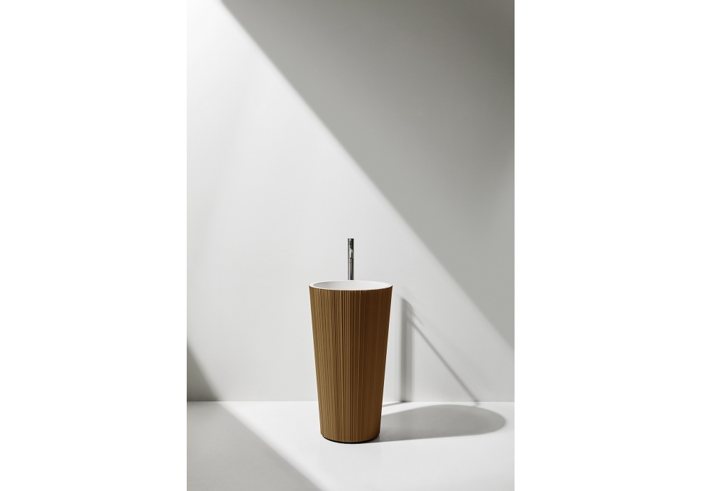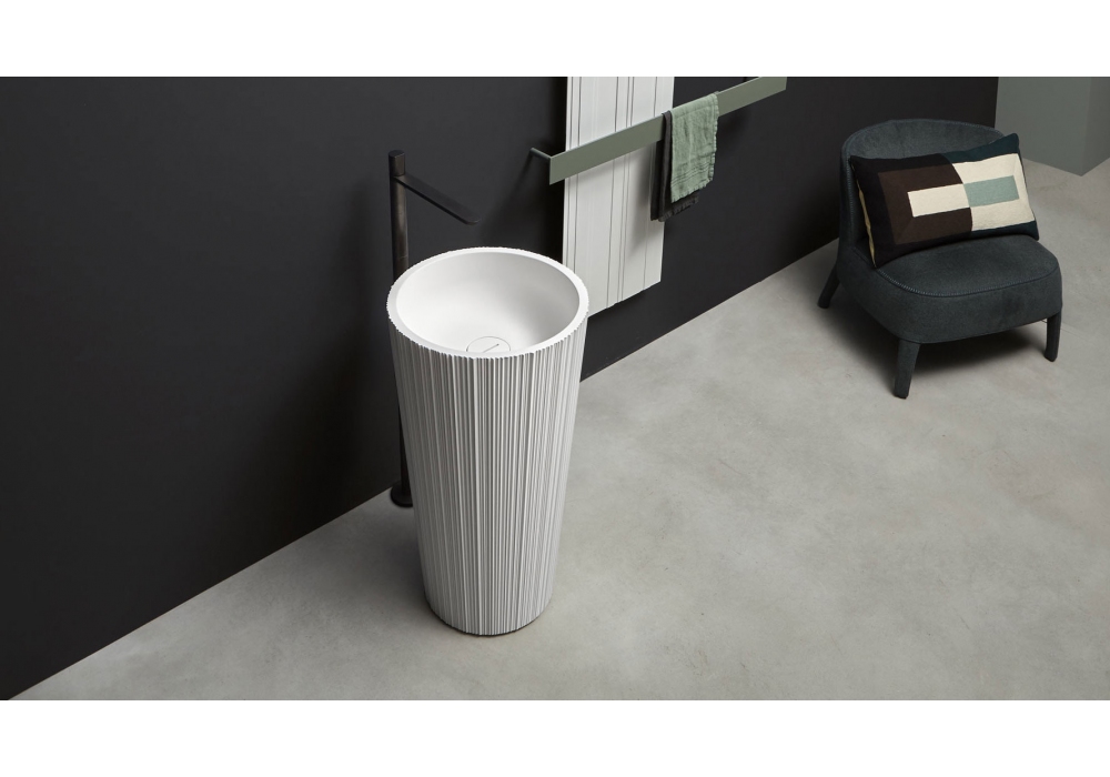 Plissé firmato da Paolo Ulian per Antonio Lupi è un lavabo da terra con bacino in Flumood con scarico a pavimento, completo di piletta con scarico libero, sifone e tubo flessibile.