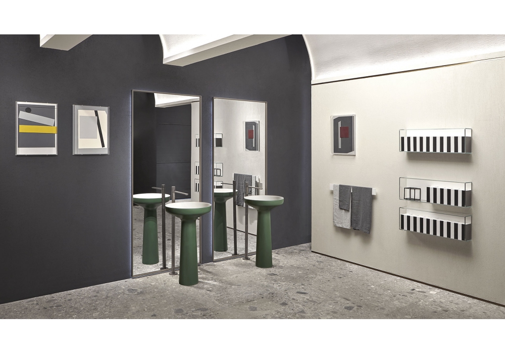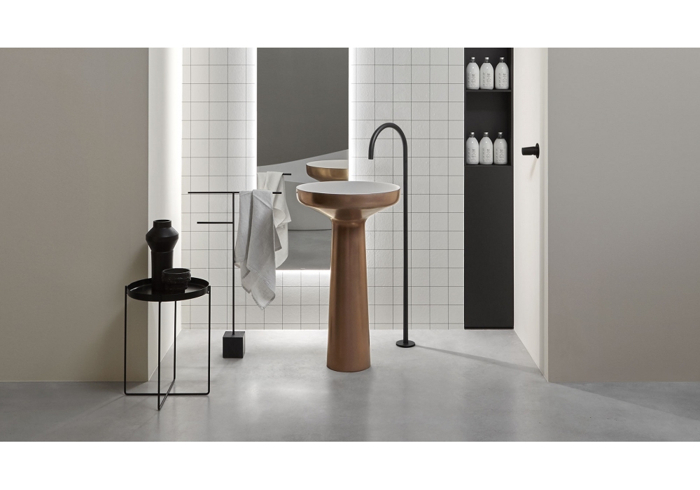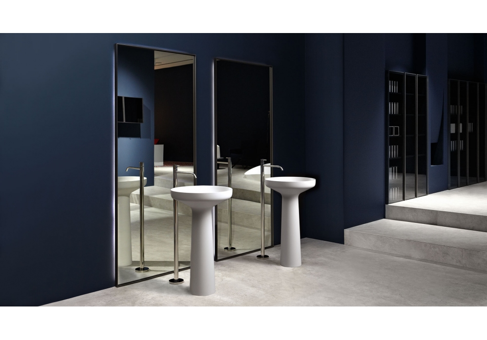 Ago85 firmato da Mario Ferrarini per Antonio Lupi è un lavabo da terra in Flumood o Colormood con scarico a pavimento, completo di piletta con scarico libero, sifone e tubo flessibile.