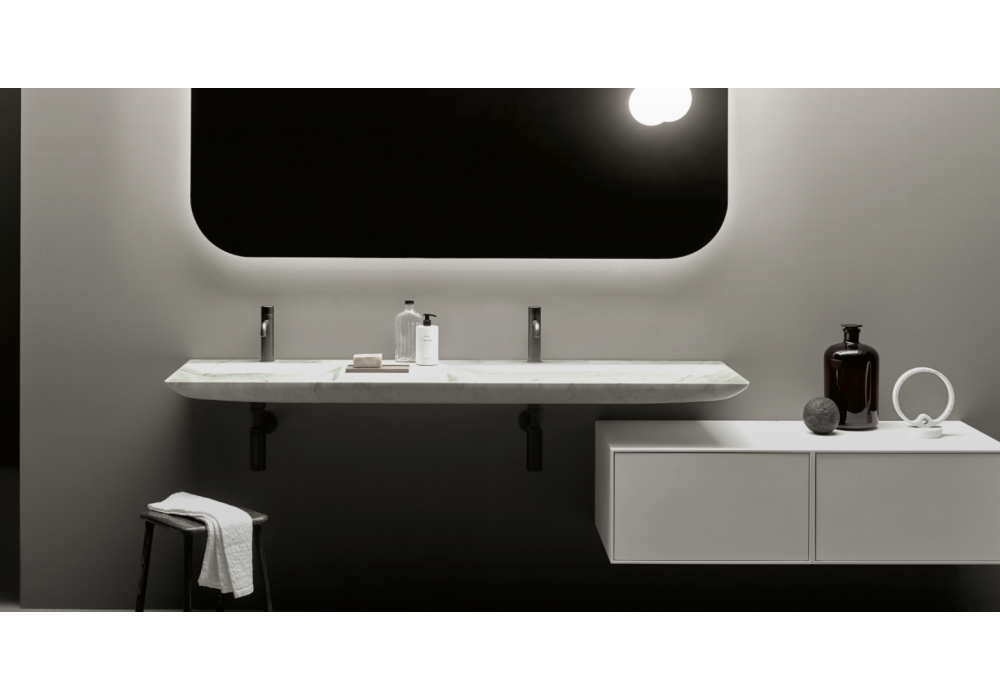 L18 firmato da Norbert Wangen è un lavabo a parete realizzati in massello di Marmo bianco di Carrara o in Pietra d'Avola, in finitura levigata opaca, con bacino singolo o doppio. Ricavati da un blocco unico, presentano forma rettangolare, con angoli smussati che enfatizzano lo spessore ridotto. Completo di tappo per piletta in finitura lavabo. Disponibile in differenti finiture.