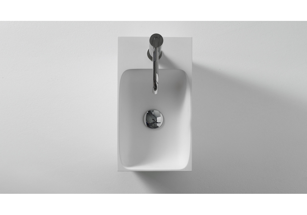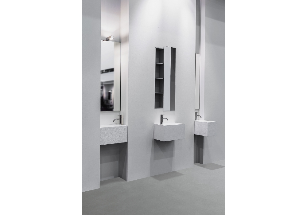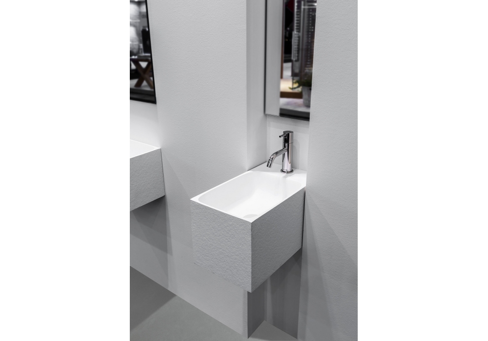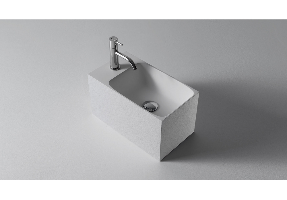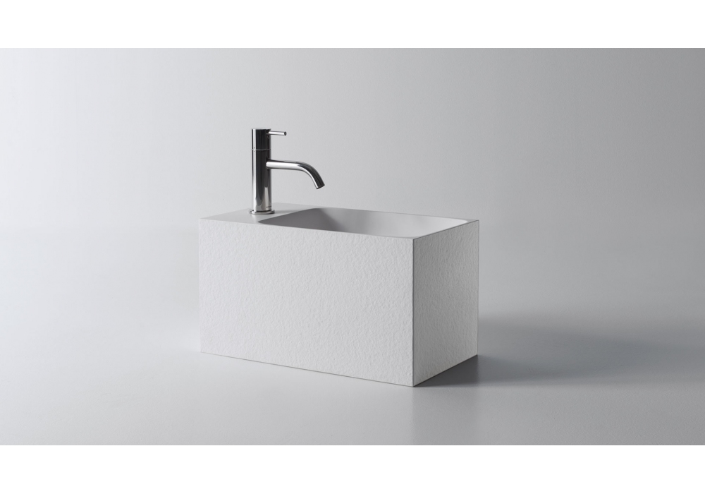 Calco firmato da Nevio Tellatin per Antonio Lupi è un lavabo rettangolare da parete in Flumood finitura texture, completo di piletta con scarico libero e raccordo per sifone.
