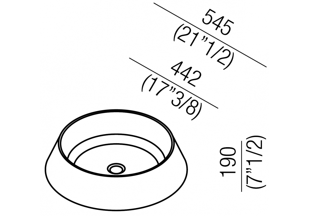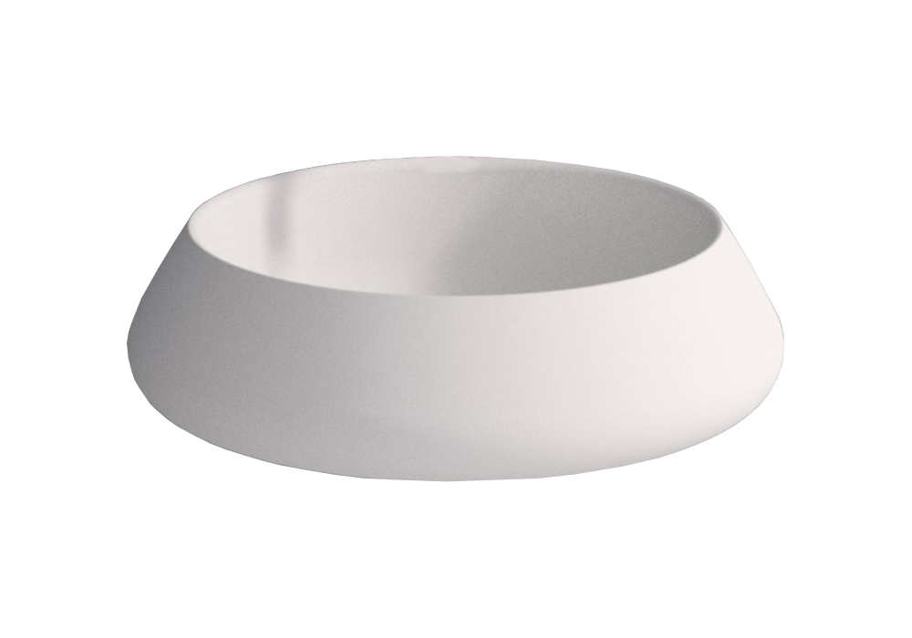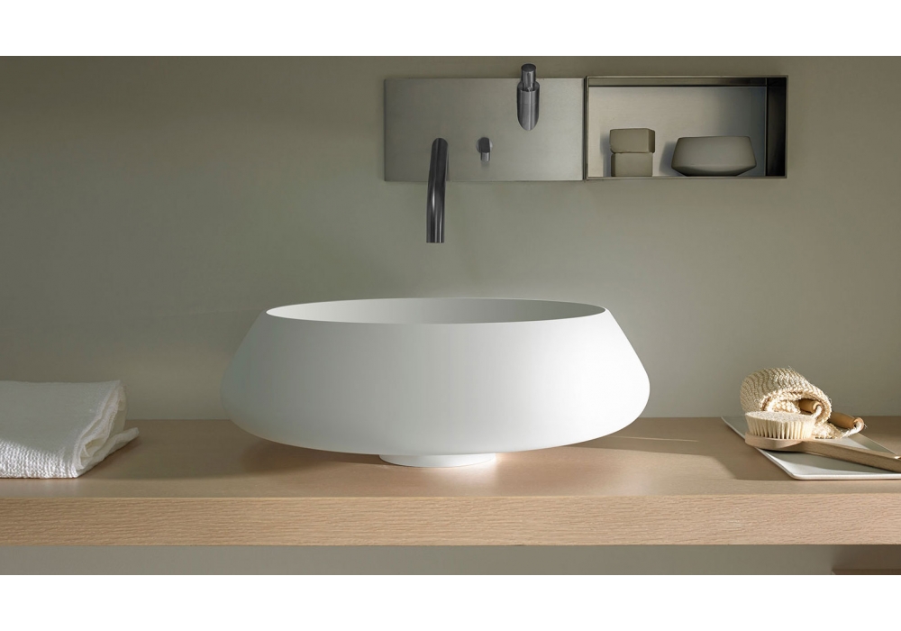 Bjhon 2 firmato da Angelo Mangiarotti per Agape è un lavabo d'appoggio circolare realizzato in marmo o in Cristalplant® biobased. É caratterizzato da un bacino tronco conico, senza foro per rubinetto. A scarico libero.