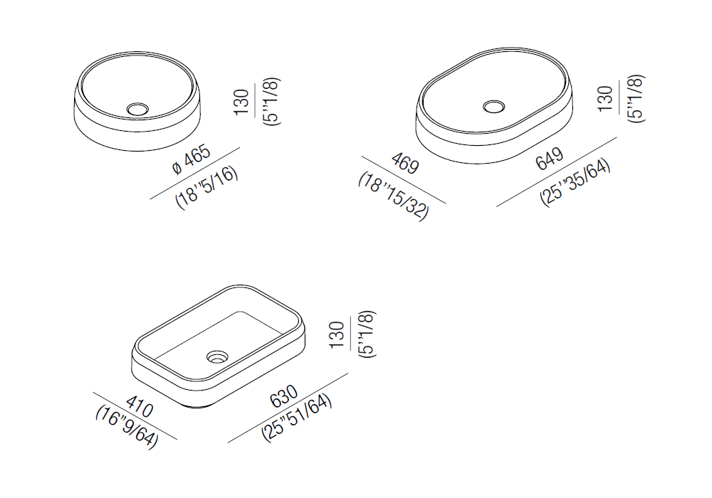 | Dimensioni | Ø 46.5 x H 13 cm; 64.9 x 46.9 x H 13 cm; 63 x 41 x H 13 cm. |