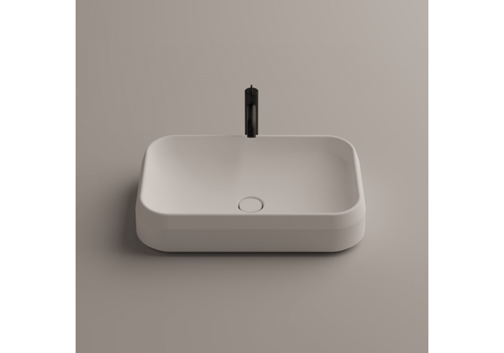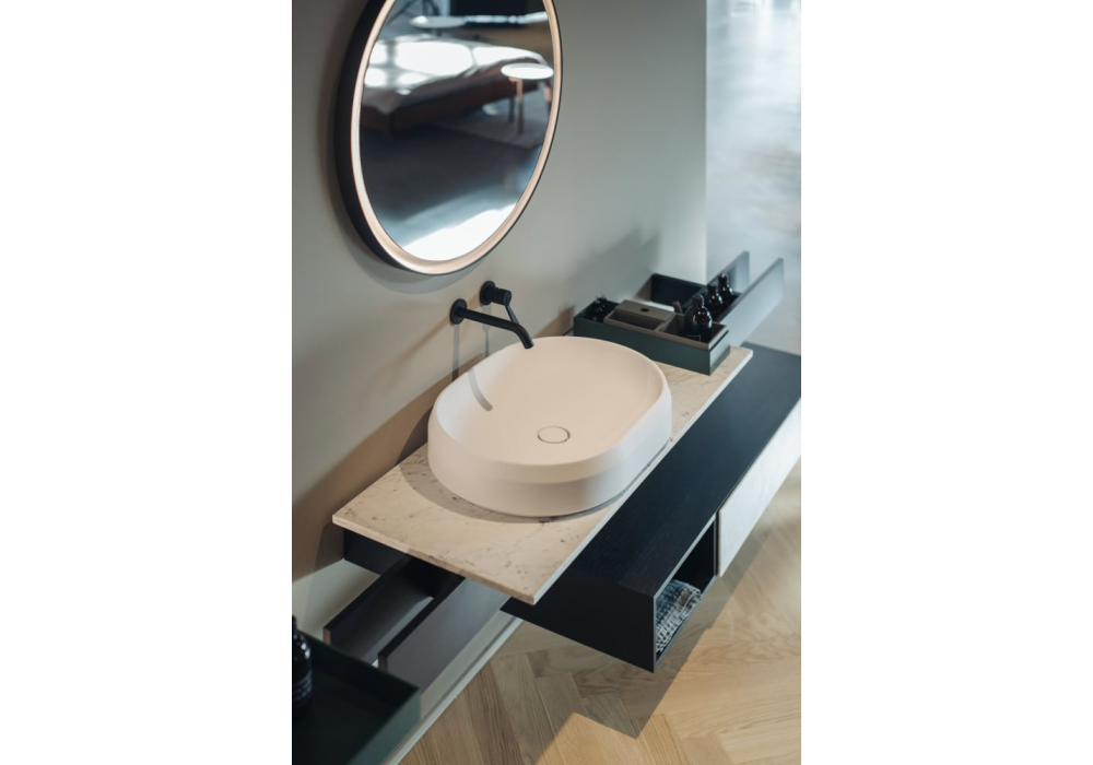 Lariana firmato da Patricia Urquiola per Agape è un lavabo d'appoggio tondo o ovale in Cristalplant® biobased oppure rettangolare in solid surface oppure in marmo in differenti finiture. Le versioni tonda e rettangolare sono realizzate anche in Cementobasic®. Il lavabo è compreso di piletta con calotta nella stessa finitura.