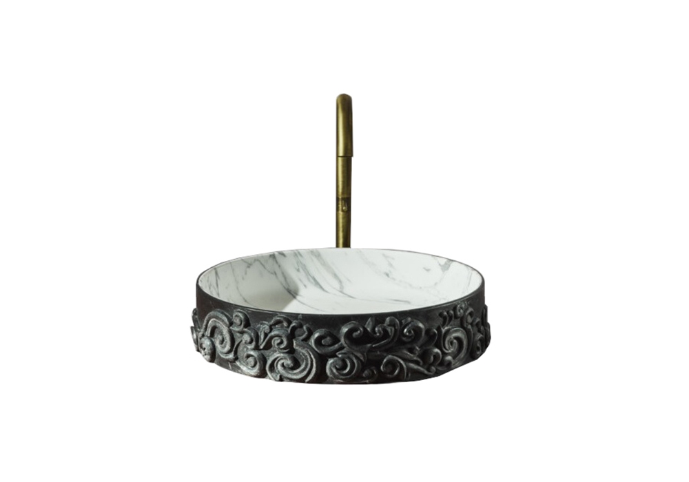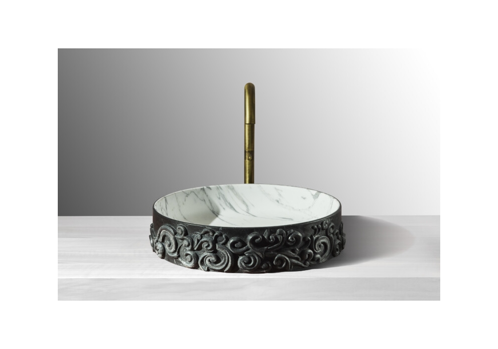 Dame firmato da Christophe Pillet per Kreoo è un lavabo realizzato in marmo liscio opaco e con motivi scolpiti a scalpello a profondità diverse. La vasca interna può essere realizzata con un marmo differente.