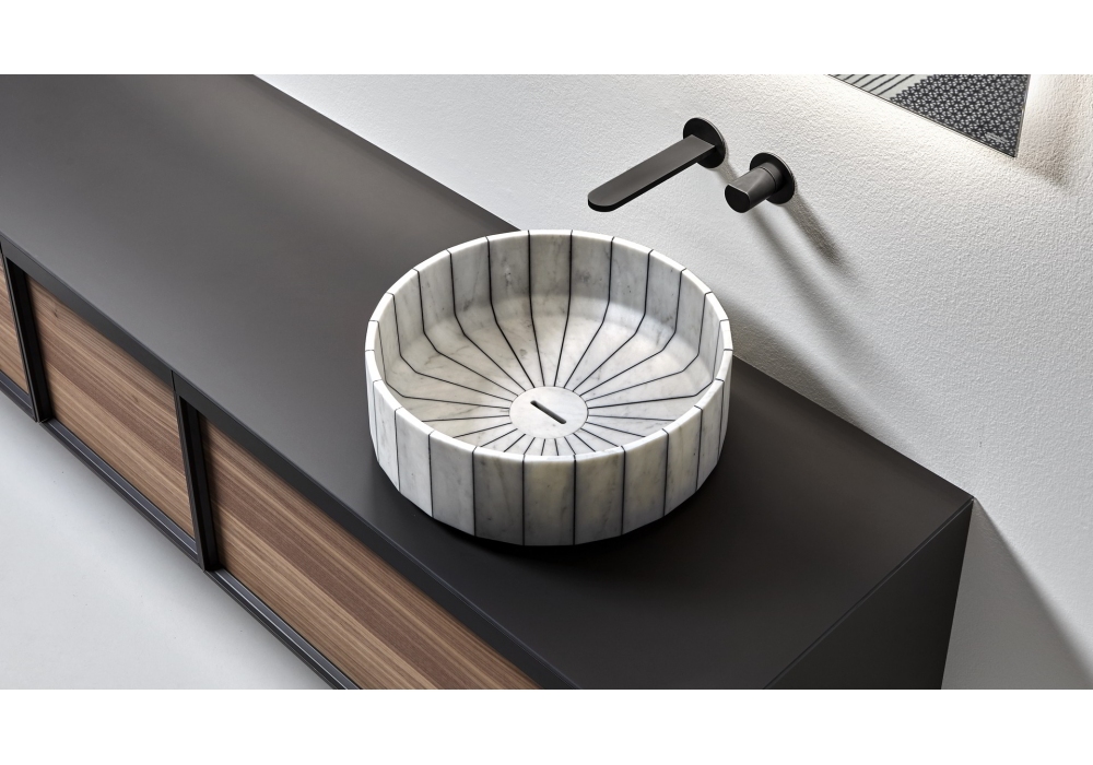 Fonte firmato da Gumdesign per Antonio Lupi è un lavabo tondo soprapiano in pietra, completo di piletta con scarico libero e raccordo per sifone.