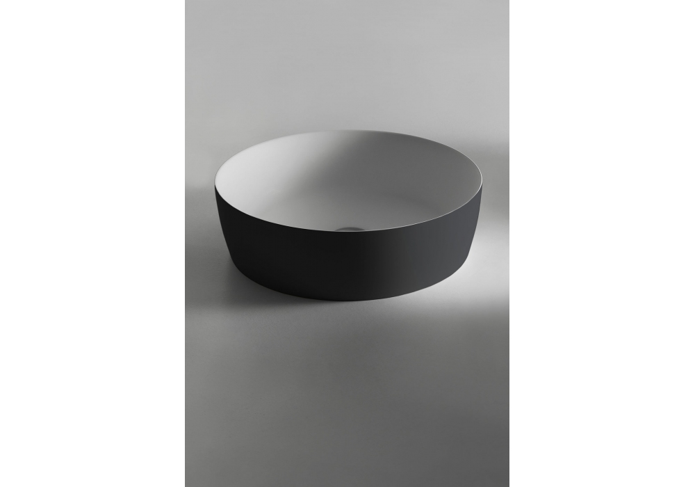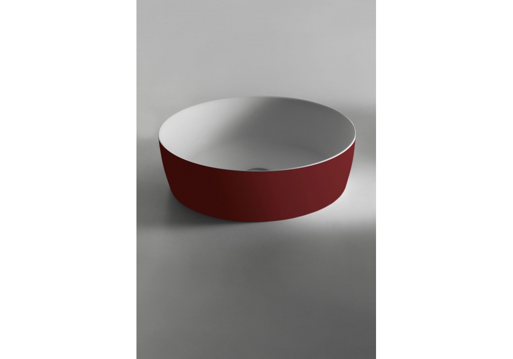 Catino firmato da Nevio Tellatin per Antonio Lupi è un lavabo tondo soprapiano in Flumood o Colormood completo di piletta con scarico libero e raccordo per sifone.