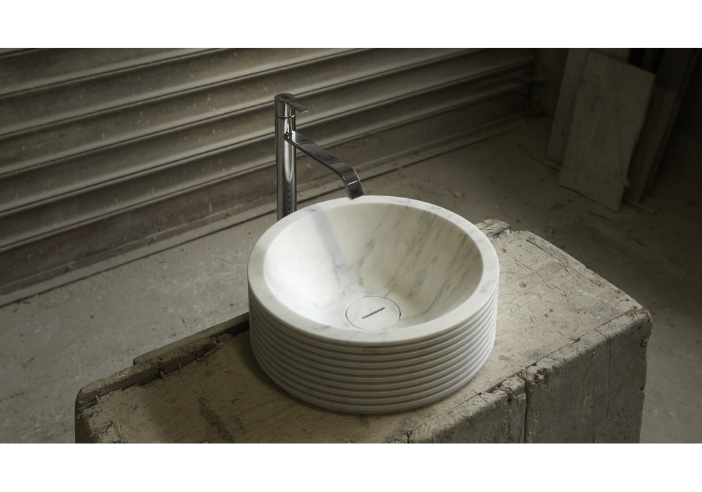 Introverso45 firmato da Paolo Ulian per Antonio Lupi è un lavabo tondo soprapiano in pietra, completo di piletta con scarico libero e raccordo per sifone.