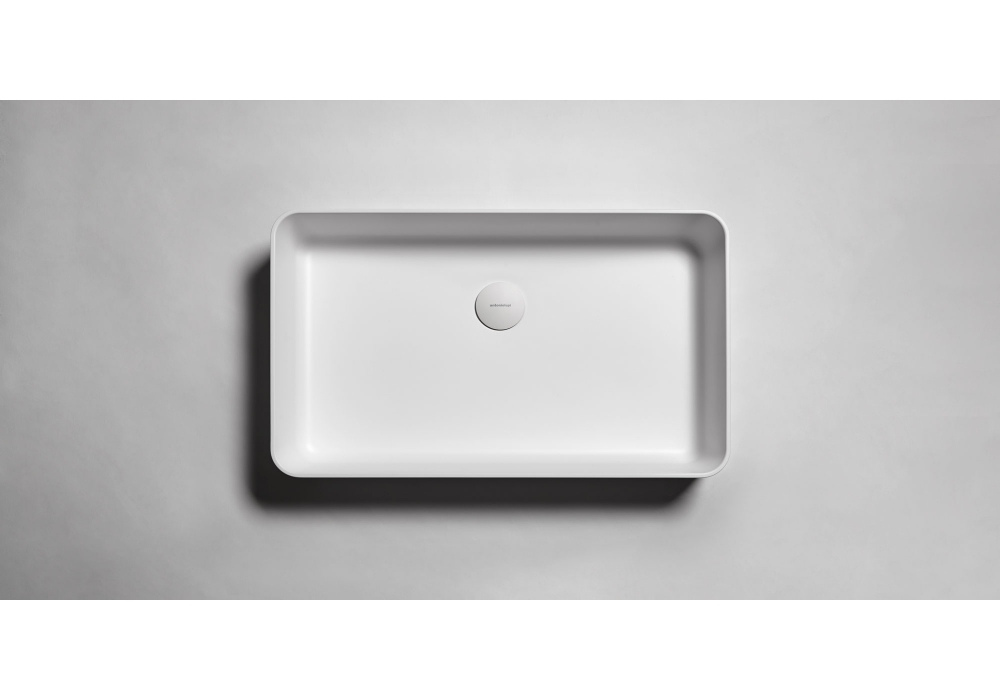 Velo firmato da Mario Ferrarini per Antonio Lupi è un lavabo soprapiano in Flumood o Colormood completo di piletta con scarico libero e raccordo per sifone.