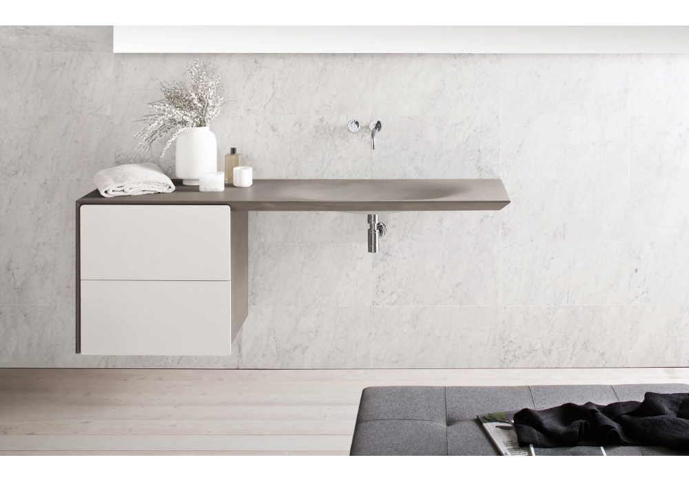 Neos firmato da Luca Martorano per Neutra è un mobile da parete con lavabo integrato disponibile in diverse finiture e 2 dimensioni. Frontali cassetti disponibili in finitura pietra o legno.