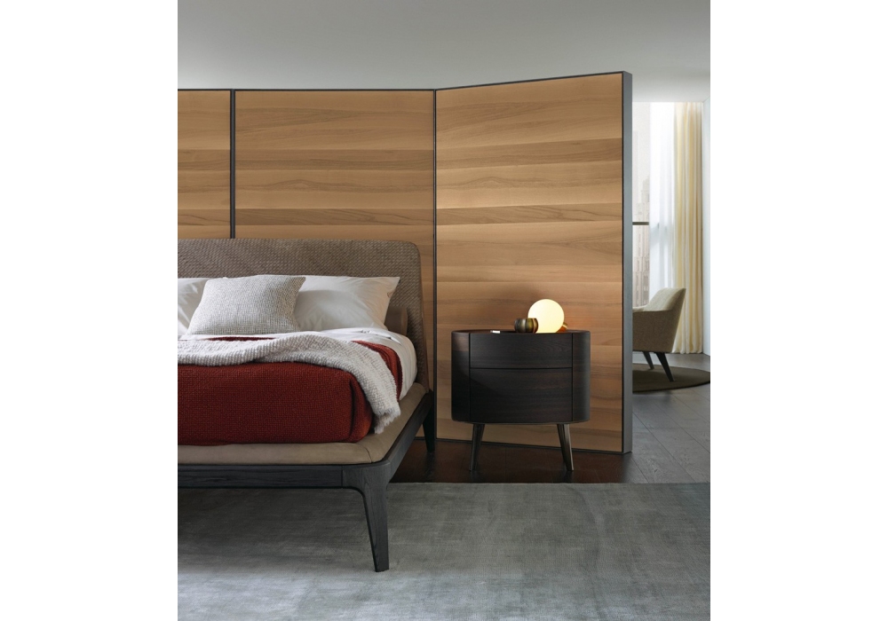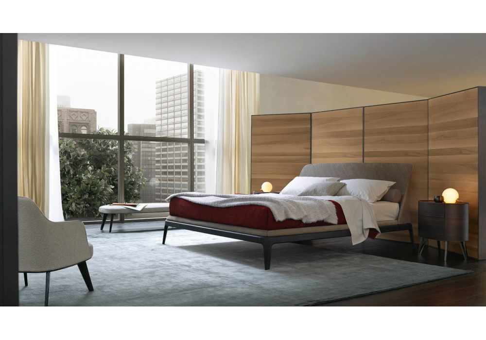 Kelly firmato da Emmanuel Gallina per Poliform è un letto realizzato con base letto in legno massello con imbottitura in poliuretano flessibile monoquota. Rivestimento in tessuto o in pelle.