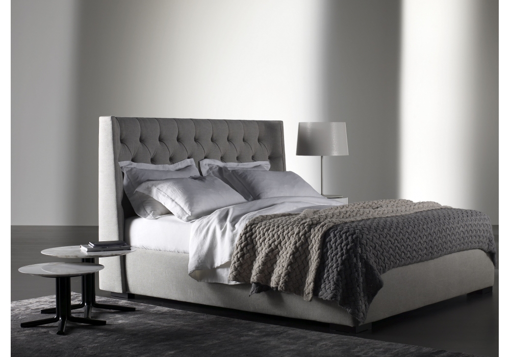 Turman Low firmato da Andrea Parisio per Meridiani è un letto tessile imbottito, rivestimento della testiera con lavorazione capitonné non sfoderabile. Struttura smontabile in legno con traverso centrale in metallo. Piedini in legno tinto black, light o almond.