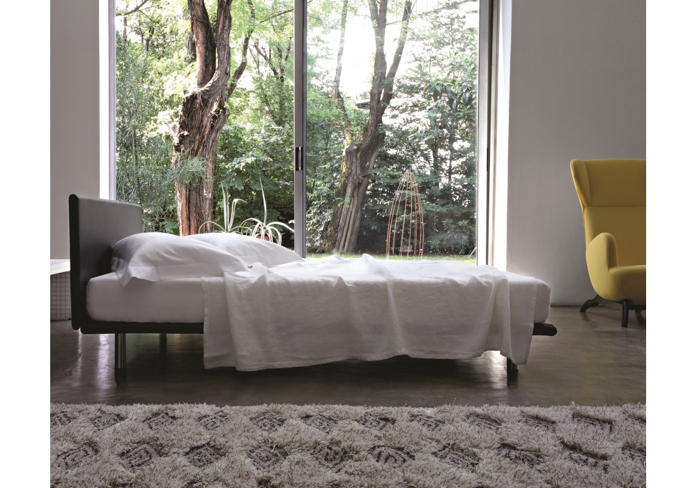 1885 Milano firmato da De Pas, D'Urbino, Lomazzi per Zanotta è un letto con struttura disponibile in acciaio verniciato naturale, doghe di faggio curvato, colore naturale. Piedini regolabili in acciaio nichelatsatinato colore naturale o nero. Rivestimento sfoderabile in tessuto o pelle o non sfoderabile in cuoio. La versione in cuoio ha le cuciture in filo bianco.
