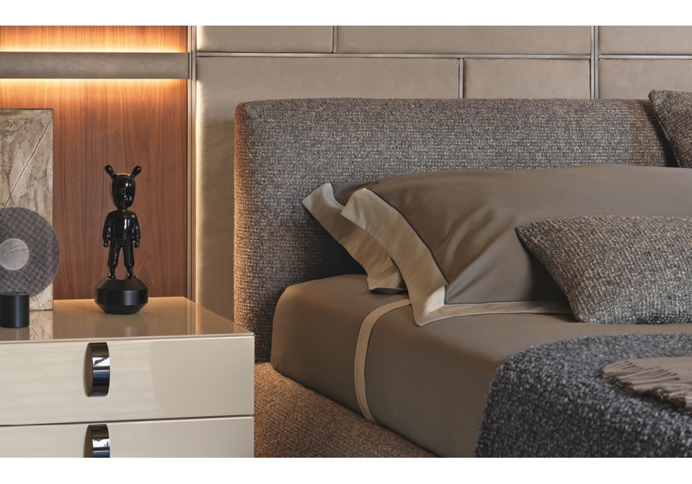 Merkurio firmato da Rodolfo Dordoni per Flou è un letto totalmente imbottito e rivestito in vari tessuti o pelli. Base smontabile disponibile anche con contenitore oppure con rete MOTION 4, dotata di 4 motori elettrici per sezione testa, spalle, gambe e piedi.