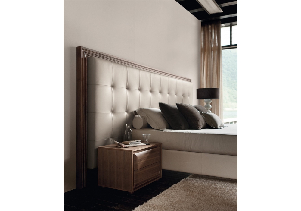 Enya è un letto con testata firmata da Opera Design e giroletto firmato da O. Moon per Porada. Testata con cornice in massello di noce canaletta disponibile in due modelli. Giroletto e testata rivestiti in pelle o tessuto. Rete a doghe in legno inclusa. Materasso non incluso.
