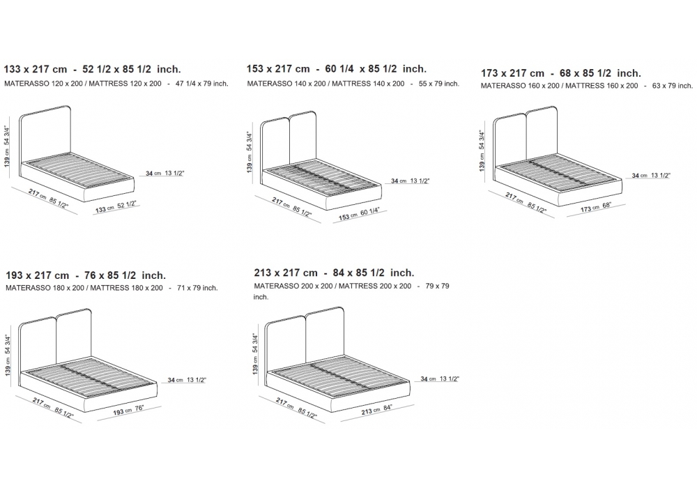 | Dimensioni materasso | 120 x 200 cm; 140 x 200 cm; 160 x 200 cm; 180 x 200 cm; 200 x 200 cm. |