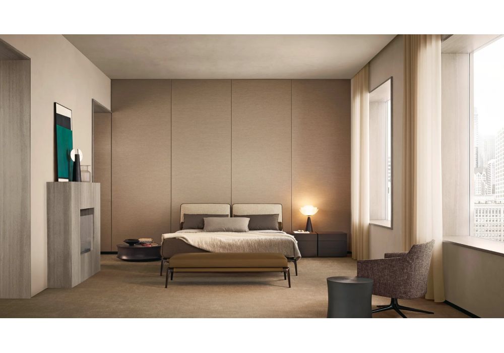Park 1 firmato da Carlo Colombo per Poliform è un letto con testata imbottita, struttura in alluminio verniciato con prerivestimento in fibra di poliestere. Rivestimento disponibile in tessuto o pelle.