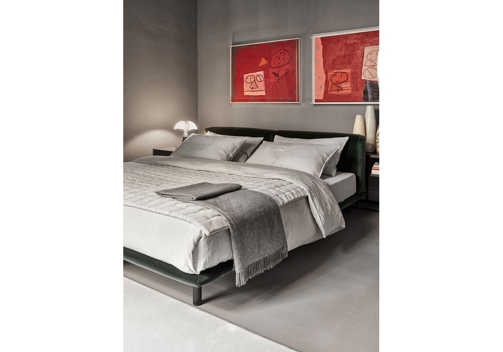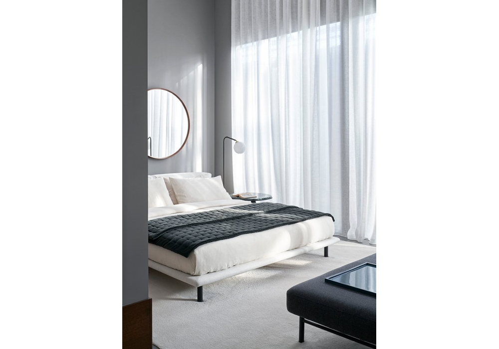 Timothy firmato da Andrea Parisio per Meridiani è un letto con struttura in metallo verniciato, imbottiture in poliuretano a densità differenziate, schiuma viscoelastica e fibre poliestere, piedini in metallo nero e rivestimento in tessuto o pelle.