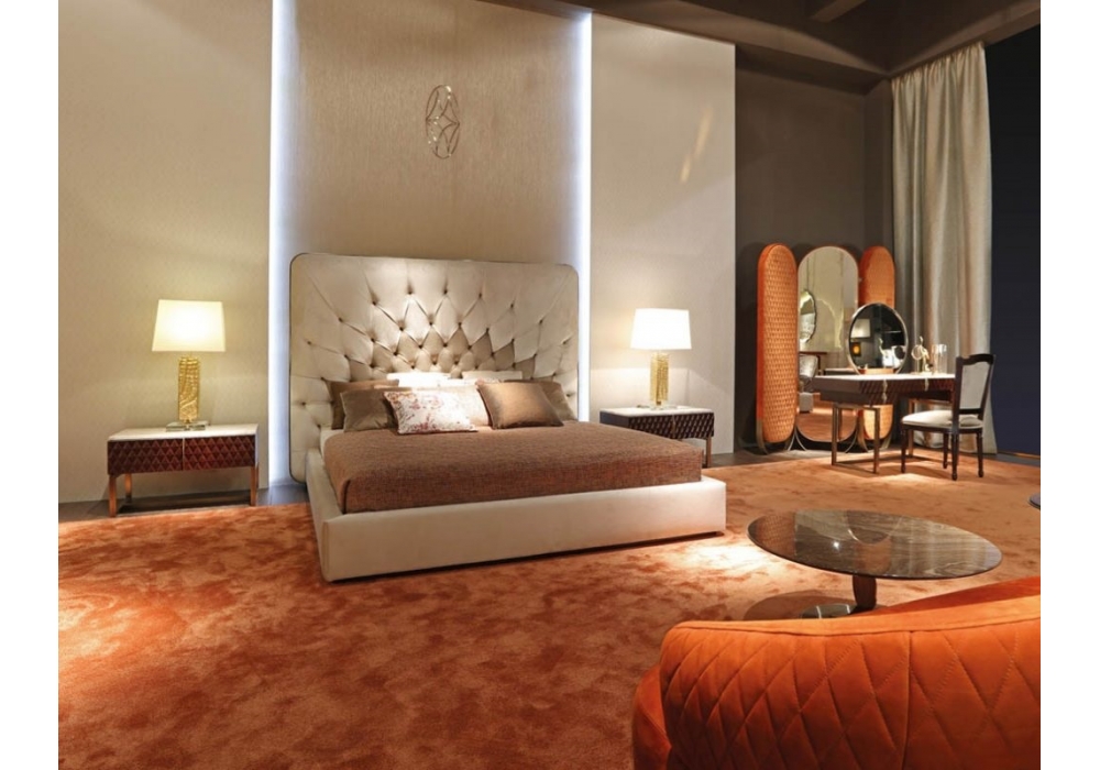 Vertigo firmato da Castello Lagravinese Studio per Opera Contemporary è un letto con un'elegante testata capitonné e cornice metallica che la circonda, disponibile in diverse finiture. Rivestimento non sfoderabile in tessuto o in pelle. Rete e materasso non inclusi.