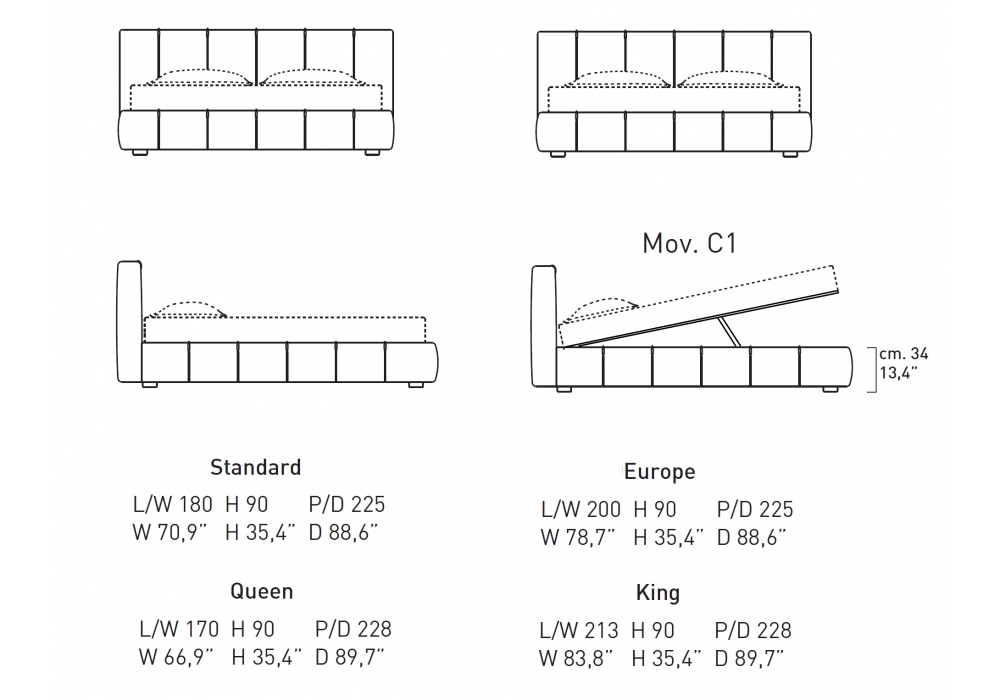 | Dimensioni | 180 x 225 x H 90 cm(Standard); 170 x 228 x H 90 cm(Queen); 200 x 225 x H 90 cm(Europe); 213 x 228 x H 90 cm(King). |