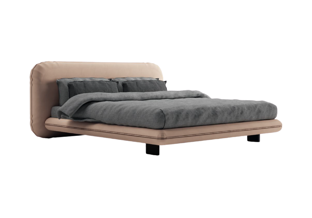 Brigitte firmato da Draga&Aurel per Baxter è un letto con struttura giroletto con tre fasce e testata in legno tamburato di abete e pioppo. Rivestimento in pelle sfoderabile e piedini in faggio tinto nero semilucido.
