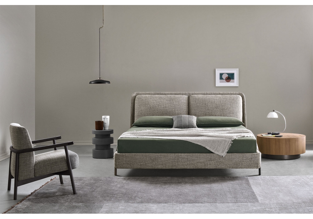 Nara firmato da Umberto Asnago per Bodema è un letto con struttura in legno rivestita in poliuretano espanso. Rete in metallo e doghe di faggio. Imbottitura in poliuretano rivestito con fodera in vellutino in fibra di nylon. Piedino portante metallico a sezione ovale di color bronzo ed inserto in legno di faggio tinto wenge. Testiera con cuscini o con lacci in cuoio. Disponibile in diverse finiture e dimensioni.