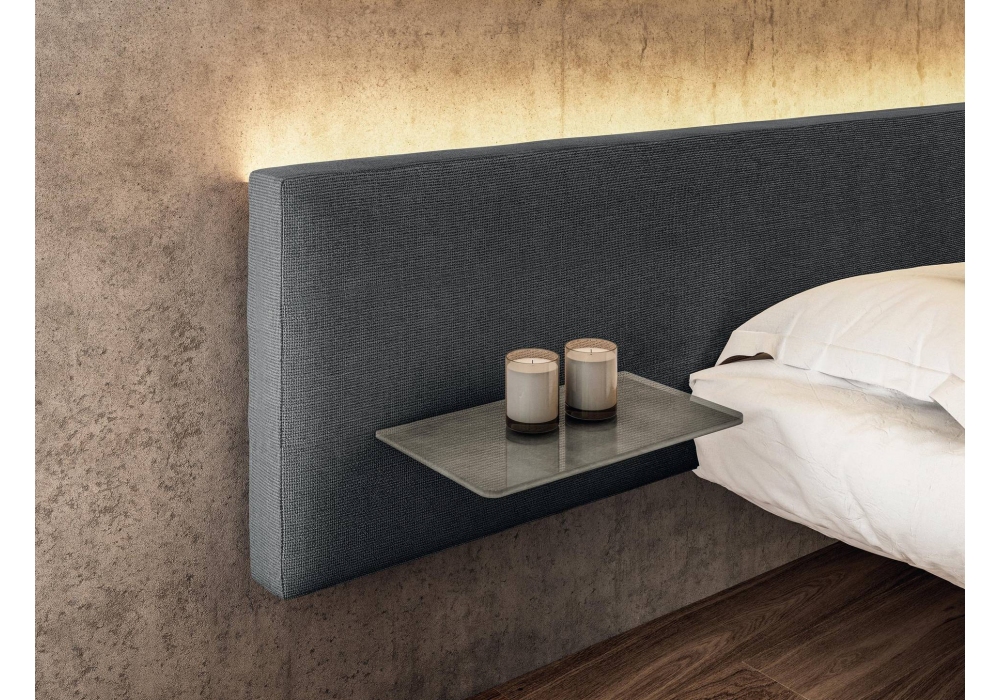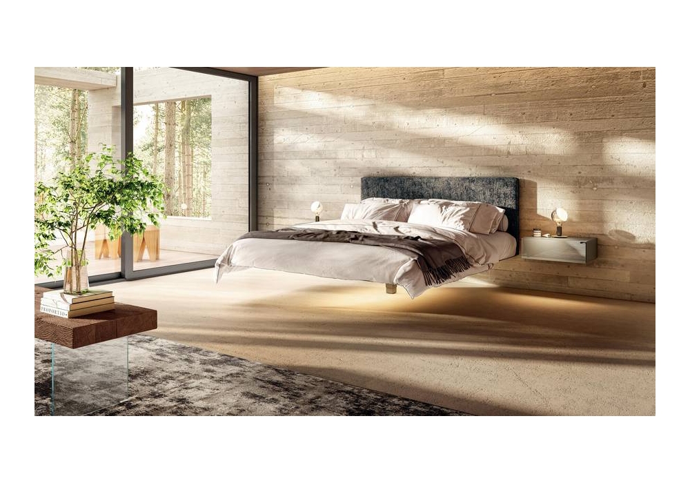 Fluttua disegnato da Daniele Lago è un letto sospeso su di un unico perno centrale. La testata è rivestita in tessuto o pelle è completamente sfoderabile. Il letto è regolabile in altezza prima del fissaggio a parete. Disponibile in diverse finiture e dimensioni.