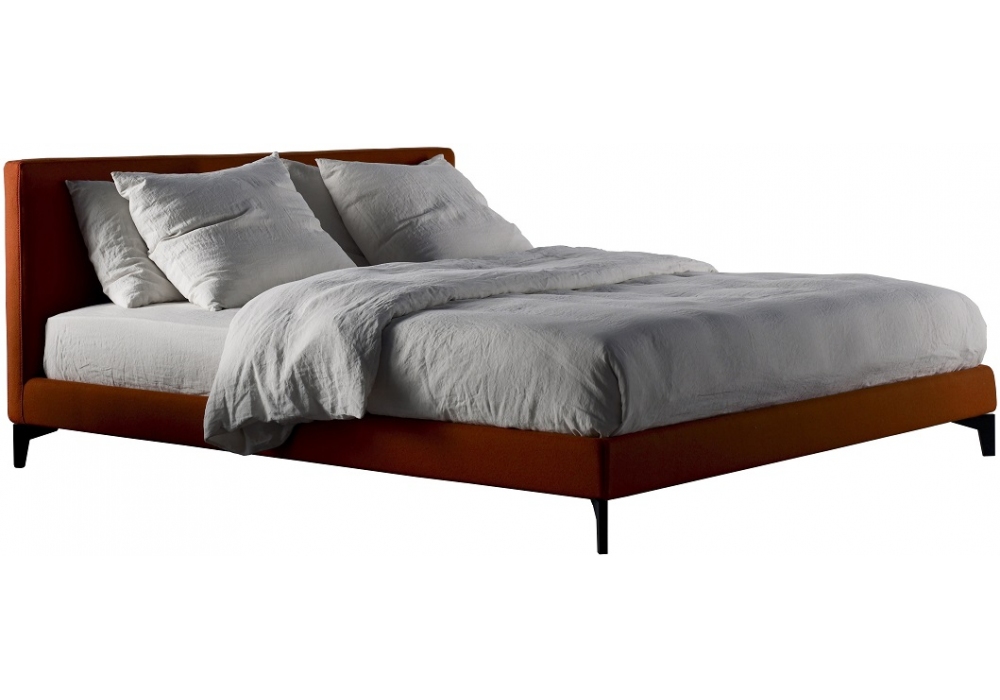 Stone Up firmato da Andrea Parisio per Meridiani è un letto tessile imbottito con piedini in metallo. Struttura smontabile in legno con traverso centrale in metallo. Rivestimento sfoderabile in tessuto, fisso in pelle.
