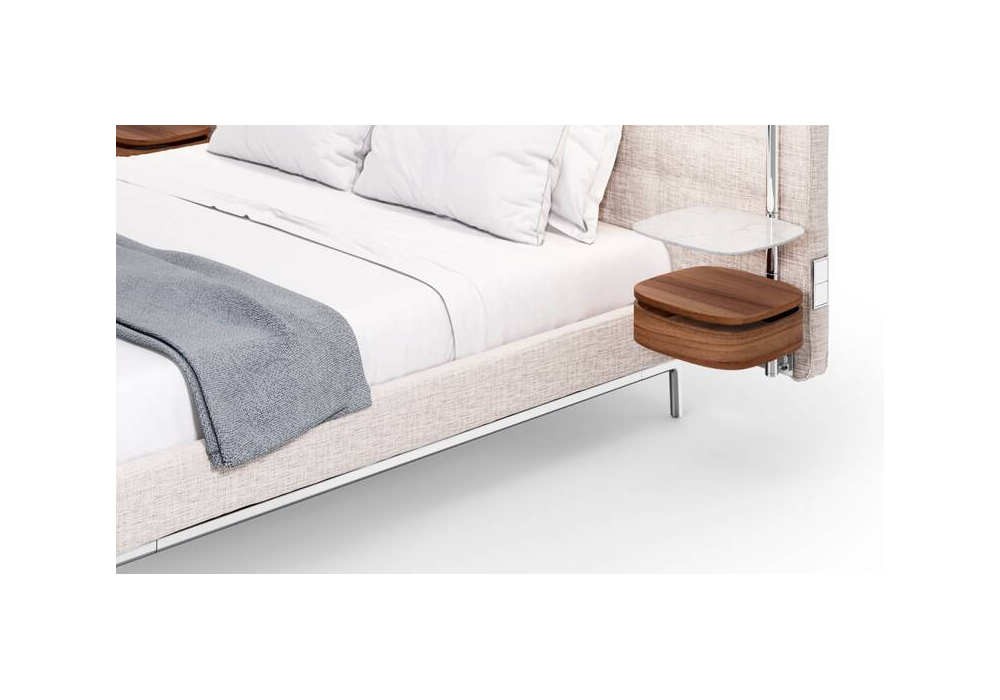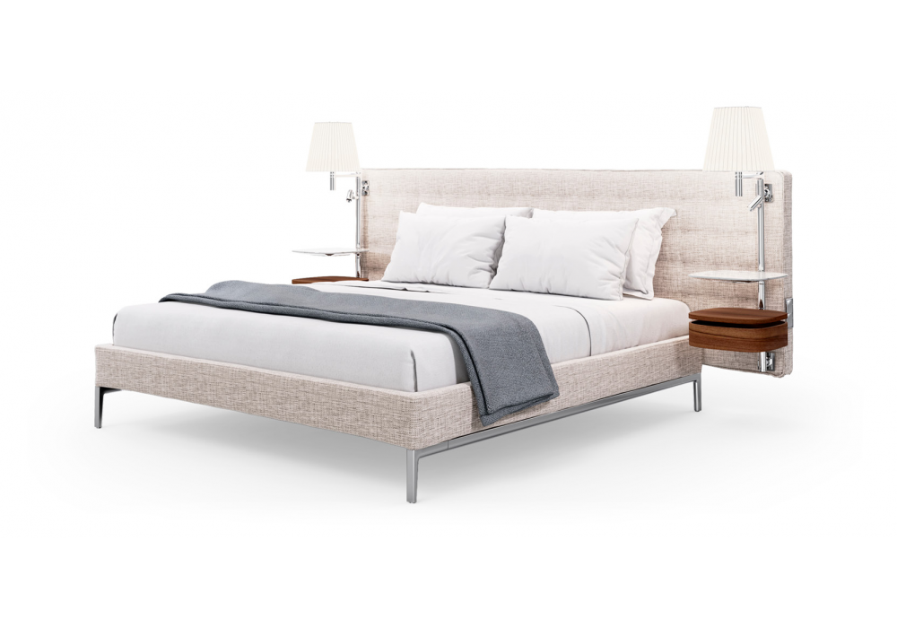 L29 Volage Ex-S Night firmato da Philippe Starck per Cassina è un letto realizzato con rivestimento in tessuto o in pelle in diverse finiture e base in metallo cromato lucido o antracite opaco. La versione con testiera larga è composta da: barra attrezzata, abat jour con paralume plissettato , ripiano e comodino girevoli in legno o con piano in marmo e prese elettriche e USB su entrambi i lati.