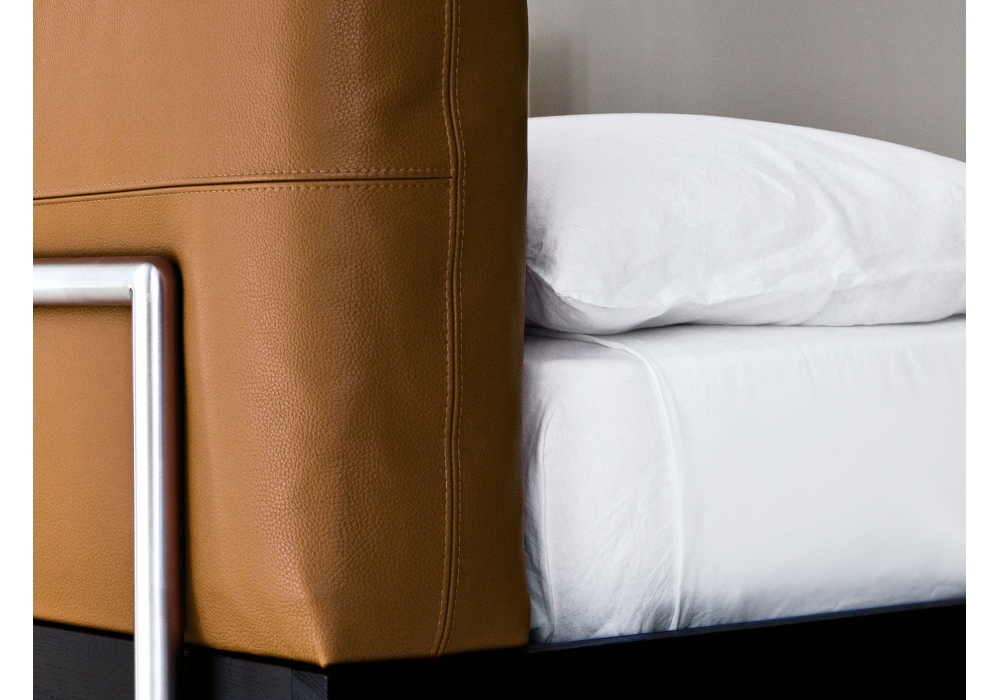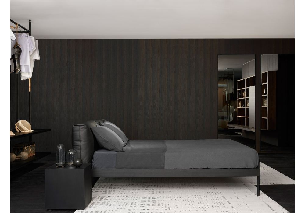 Shin firmato da Piero Lissoni per Porro è un letto composto da giroletto in massello di frassino tinto nero, pediera in tubolare di acciaio e testiera in tubolare di acciaio con due cuscini in tessuto, pelle o ecopelle.