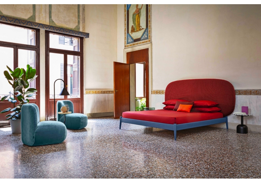 Shiko Magnum firmato da E-ggs per Miniforms è un letto con struttura in frassino o anillina blu intenso, schienale leggermente curvato con rivestimento in tessuto o ecopelle. Disponibile in diverse finiture e dimensioni.