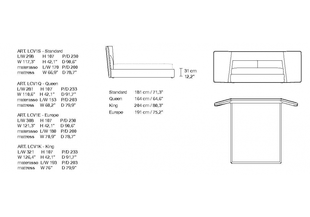Coventry Naked firmato da Giuseppe Bavuso per Alivar è un letto realizzato con testata in legno imbottita in poliuretano espanso a densità differenziata con fodera in fibra di poliestere. Struttura giroletto in multistrato di abete rivestita in poliuretano espanso e vellutino accoppiato. Rivestimento in pelle o tessuto. Rete in multistrato di betulla con doghe curve con regolatori di rigidità nella zona lombare. Disponibile anche nella versione con contenitore con rete alzabile.