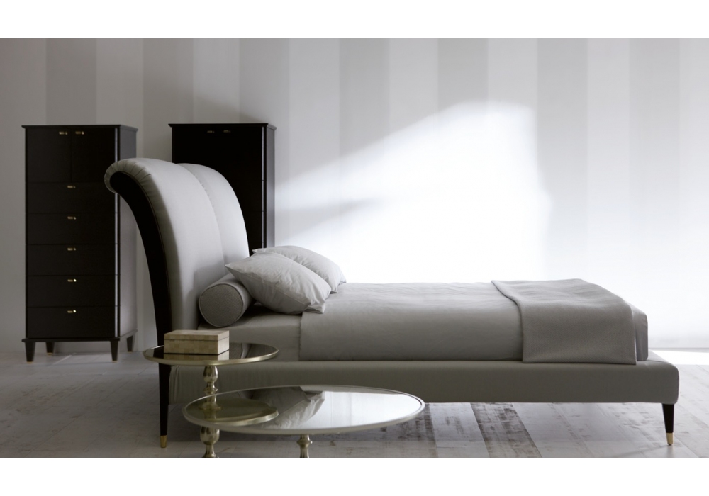 Iris firmato da Castello Lagravinese Studio per Opera Contemporary è un letto con piedini realizzati in legno di frassino con puntali in metallo e rivestimento disponibile in tessuto o pelle.
