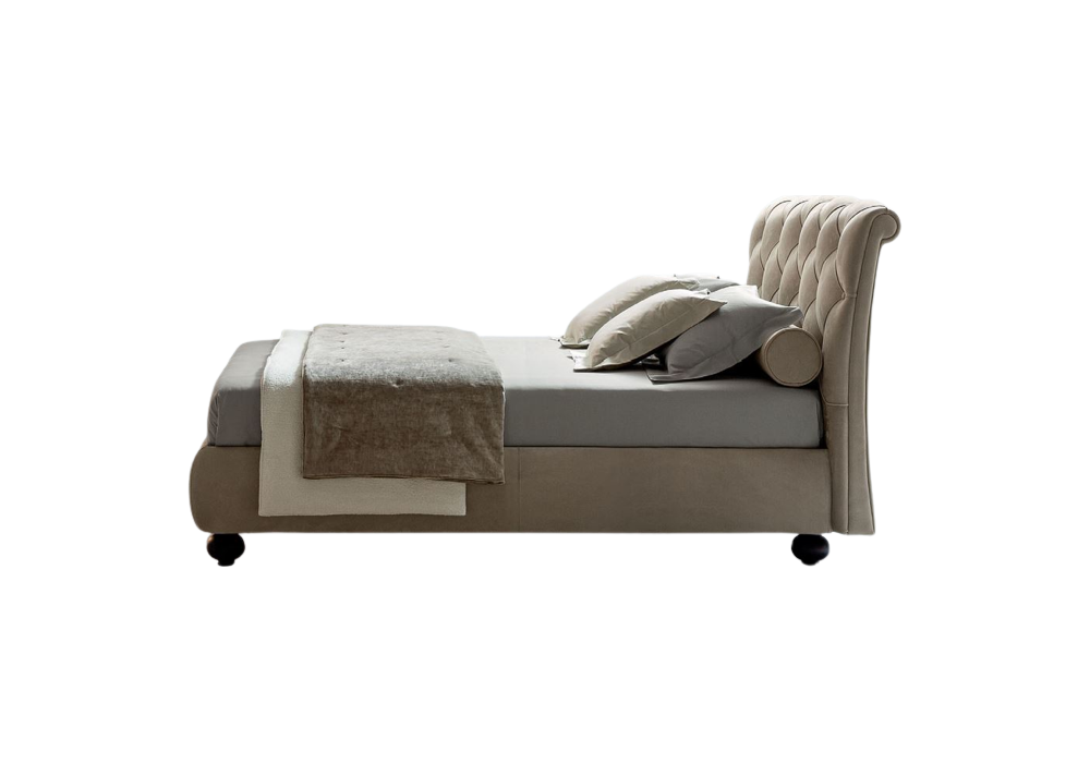 Dorian firmato e prodotto da Twils è un letto imbottito con giroletto alto 28 cm, realizzato in diverse dimensioni. Il rivestimento, non sfoderabile, è disponibile in diversi tessuti e colori. I piedi (PIE48) sono a cipolla bombati con finitura noce canaletto (su richiesta, disponibili anche in altre forme e finiture).