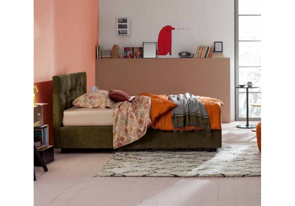 Max Basso Capitonnè disegnato e prodotto da Twils è un letto singolo con giroletto alto 28 cm. I piedi sono in madreperla (PIE3D). Rivestimento sfoderabile in diversi tessuti e colori. Disponibile in diversi modelli e dimensioni. Su richiesta, i piedi possono essere realizzati in altre finiture.