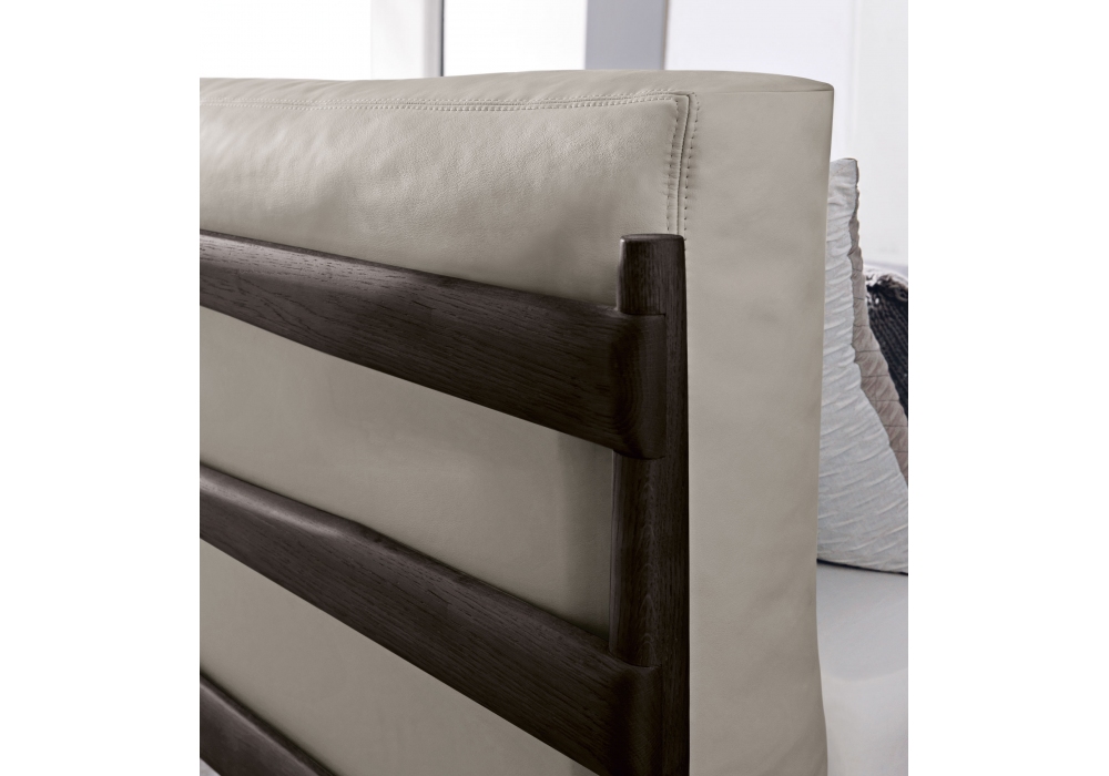 Eladio firmato da Allievi & Viganò per MisuraEmme è un letto con rete fissa realizzato con struttura interamente in massello di rovere sagomato e rifinito a mano e traversi in acciaio per appoggio rete. Cuscinature testata in poliuretano espanso e materassina in piuma. Rivestimento in tessuto o pelle sfoderabili con laccetti posteriori per l’ancoraggio alla testata.