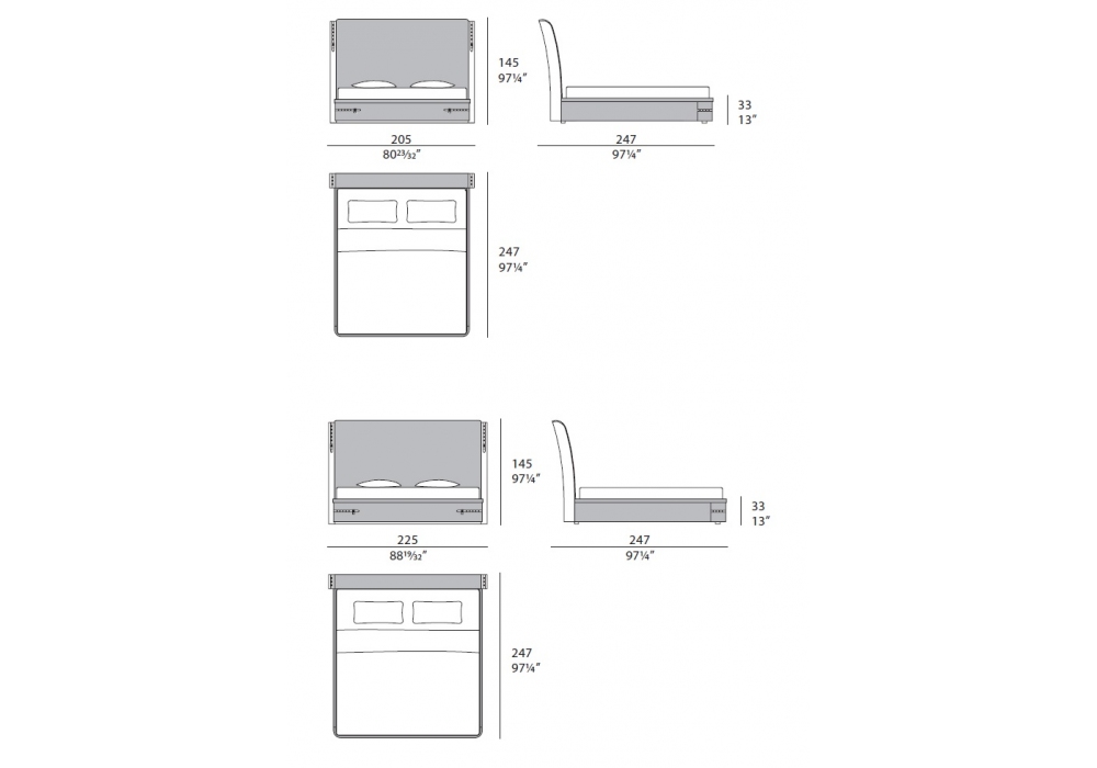 | Dimensioni | 205 x 247 x H 145 cm (180 x 200 cm); 225 x 247 x H 145 cm (200 x 200 cm). |