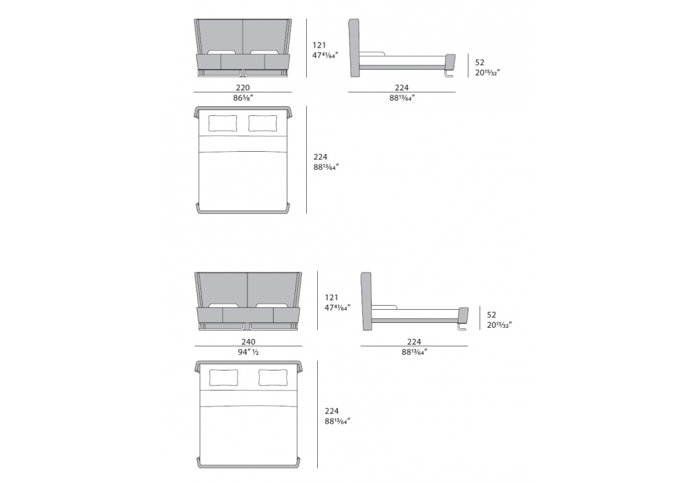 | Dimensioni | 220 x 224 x H 121 cm (180 x 200 cm); 240 x 224 x H 121 cm (200 x 200 cm). |