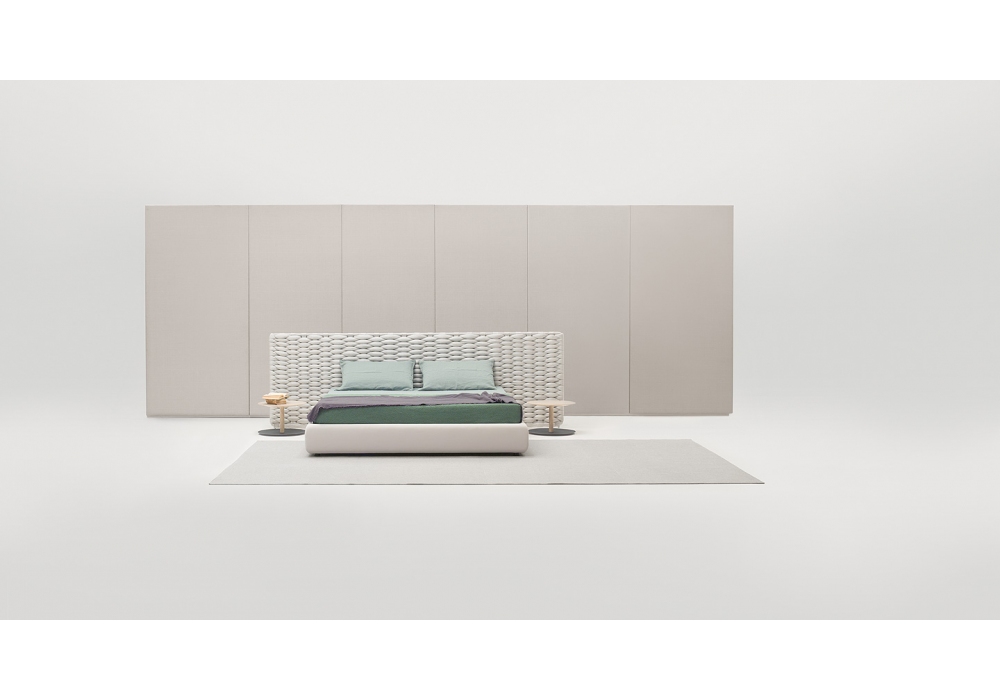Silent Line firmato da Francesco Rota per Paola Lenti è un letto con rivestimento sfoderabile e testata rivestita in maglia tubolare Chain imbottita in poliestere. Disponibile in diverse dimensioni. Rete a doghe inclusa.