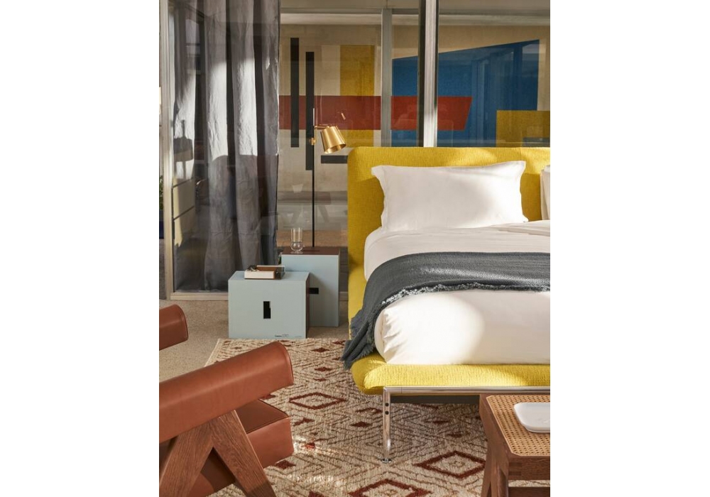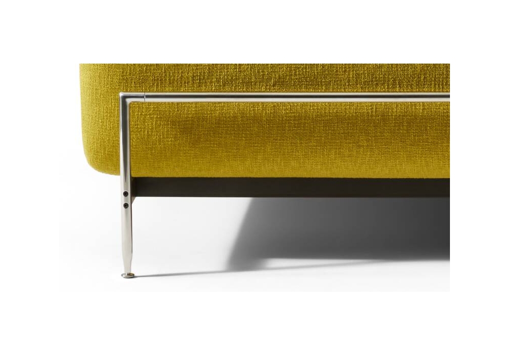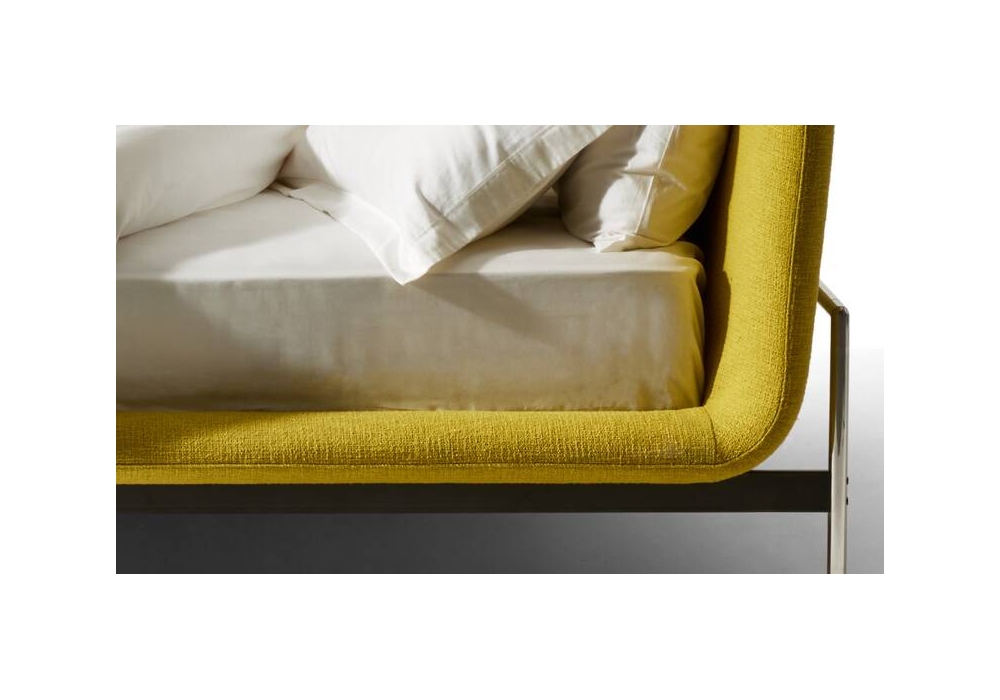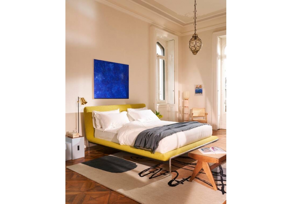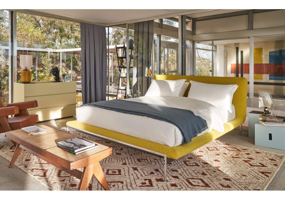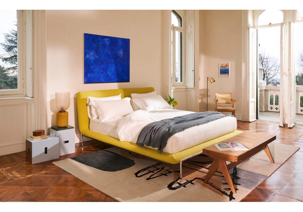 Esosoft firmato da Antonio Citterio per Cassina è un letto realizzato con basamento in metallo verniciato antracite opaco, struttura tubolare e rivestimento in tessuto. Imbottitura in poliuretano espanso con una percentuale di polioli derivati da origine biologica e pannello in Soundfil®, rivestimento in ovatta di PET riciclato, rivestimento amovibile.