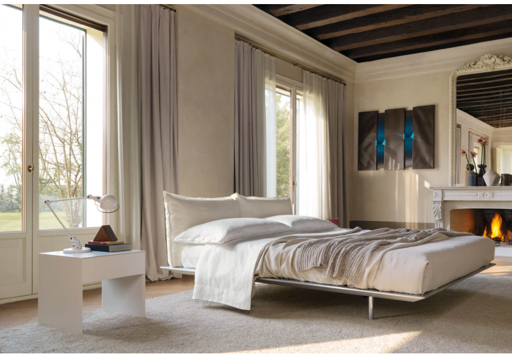 Platz firmato da R&S désirée per Désirée è un letto con struttura in alluminio, multistrato e metallo. Imbottitura testiera in poliuretano ecologico con densità differenziata e piuma rivestita con tela di cotone. Il rivestimento è in tessuto o pelle completamente sfoderabile. Piedini in alluminio lucido.