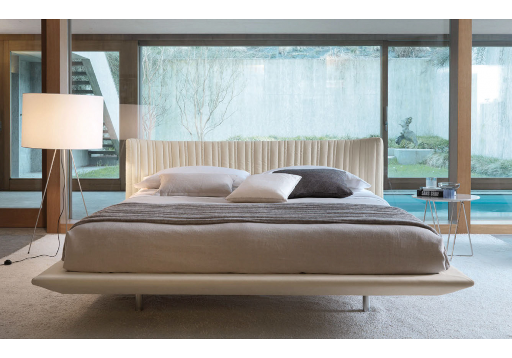 Shellon firmato da Setsu & Shinobu Ito per Désirée è un letto con struttura in metallo e multistrato, imbottita in poliuretano e rivestita con tessuto protettivo accoppiato. I piedini sono realizzati in alluminio lucido oppure su richiesta in finitura bronzo opaco. Rivestimento completamente sfoderabile in tessuto o pelle. La fodera della testiera presenta internamente una trapuntatura verticale.