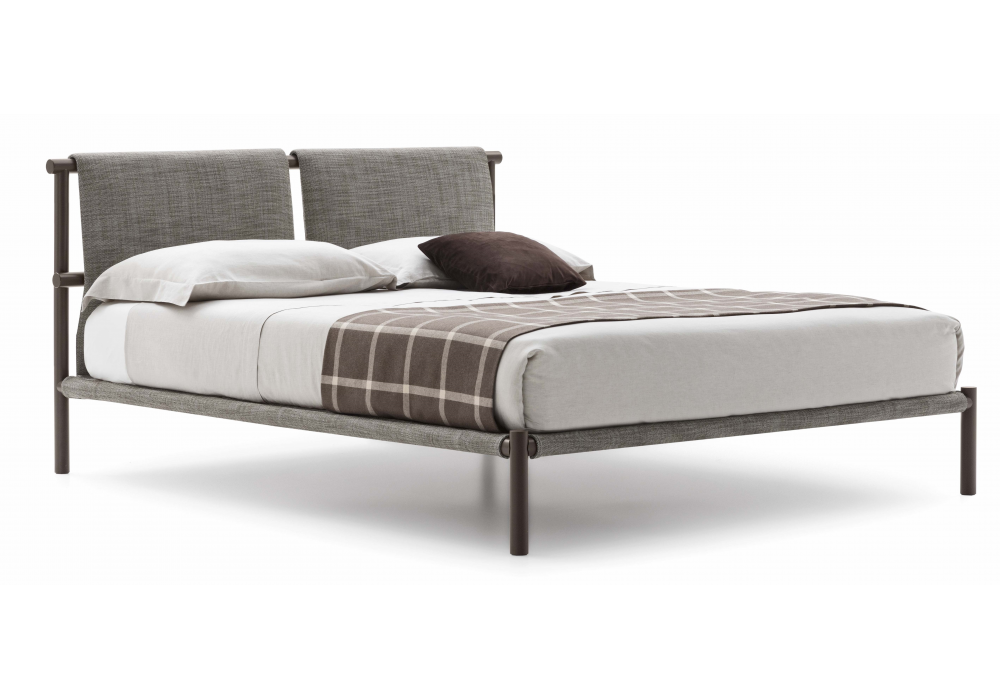 Jetty firmato da Gordon Guillaumier per Alf Dafrè è un letto con struttura in metallo in finitura elettrocol e testiera rivestita in cuoio, pelle, ecopelle o tessuto.